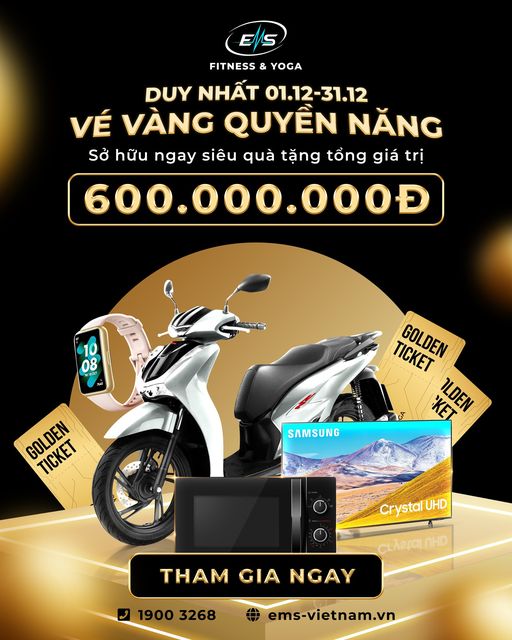 Dịp cuối năm 2022, EMS Fitness & Yoga xin gửi đến bạn chương trình bốc thăm trúng thưởng “Vé vàng quyền năng” chưa từng có. Sở hữu trong tay tấm vé vàng, bạn sẽ có cơ hội trở thành người may mắn nhất đêm tiệc cuối năm với cơ hội trúng những siêu quà tặng tổng giá trị lên tới 600.000.000đ bao gồm xe máy SH, tivi Samsung 60 inches, lò vi sóng Toshiba,…